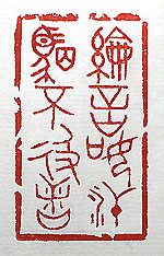 縦横・・5x3cm 金文で刻した、「綸言如汗駟不及舌」(綸言汗の如く駟 も舌に及ばず)である。天子の言は一度發せられたら、 汗の如く引っ込める事など出來ず、同様に失言は四馬 で追っても追いつけず、失言の取り返しはつかないと言 う事である。故に、發言には慎重の上にも慎重を期し、 決して輕い氣持ちで失言を繰り返す様な事をしてはい けないのである。古來より悪事千里を走ると言うが、今 はネット情報時代であれば、千里どころか瞬時に世界 を駆け巡る、事の重大性を後で後悔しても既に追いつ かない。故に、発言には努々注意を払う必要が有る。 因みに、「綸言」は『禮記』緇衣篇に、「如汗」は『漢書』 劉向傳に、「駟云々」は『論語』顔淵篇に、各々有る言 葉である。 |
