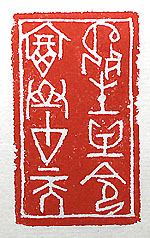 縦横・・5x3cm 『論語』顔淵篇の有名な一句を、甲骨文で刻した「死生 有命富貴在天」(死生に命有り、富貴は天に在り)であ る。前にも言ったが、己は甲骨文のこの「死」の形が大 好きである。まるで死に神に覗き込まれている様な字 形である。己にとって富貴などは無縁の事であるが、死 生に關しては、確かに「命」が有るであろう。然らば其の 命に肅々と從うのみであろう。命に從い命を樂しみたい と願って已まない。 |