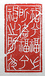 縦横・・5x3cm 大きく皹割れの入った石で、此を利用して何か出來ない かと考え、割れた碑文の様なものに仕立ててみようと思 った。其處で同じ文字が二回づつ使われており(禍・ ・兮・之・所)、一回なのは倚と伏だけと言う、『老子』第 五十八章の一句を選び、金文で刻した「禍兮tV所倚 ya禍之所伏」(禍はbフ倚る所、bヘ禍の伏する所) である。何事につけ物事と言うのは、將に「禍bヘ糾え る縄の如し」であろう。この石の皹も最初は無かったが、 投げて置いていた内に、いざ彫ろうと取り出したら、斯く の如き大きな皹割れが生じていた。 |
