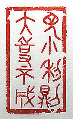 縦横・・5x3cm 『論語』子路篇の一句を、戰國篆文(三晉篆)で刻した「 見小利則大事不成」(小利を見らば大事は成らず)であ る。何事も目先の利益を追い求めると、本來的な重要 な事を忘れてしまい、大魚を逃す事になる。テーブルに 置かれた生ビールのジョッキを眺めながら、せめて三杯 ぐらいはと小利が囁きかけるが、其れをぐっと押さえて 一杯で我慢している。この様な小利は分かり易いが、一 見大事が見えない様な小利は、ついつい其れを求めて しまい、『孟子』に云う「類を知らず」の輩に陥ってしまう、 凡人の悲しさである。 |