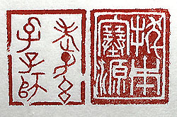 縦横・・3x2.4cm 『春秋左氏傳』の昭公九年の一句を、印篆で刻した「抜本 塞源」(もとを抜き源を塞ぐ)と、『漢書』古今人表の張る晏 注を、金文で刻した「老子玄孔子師」(老子の玄、孔子の 師)である。『左傳』には、「伯父若し冠を裂き冕を毀ち、本 を抜き原を塞ぎ、謀主を弃つれば、戎狄と雖も其れ何ぞ余 一人有らん」と有り、災いや弊害の根本を取り除く事を言う 。亦た『漢書』には、「老子の玄默、仲尼の師とする所、聖 に在らずと雖も、要は大賢爲り」と有る。老子は玄默を孔 子は師とする所を、共に明白には語らないが、要は深遠 にして奥深い部分の事である。 |