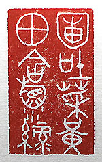 縦横・・5x3cm 関東も梅雨入りした、田舎ではこの時期を菜種梅雨と言 うが、ふと子供時代の田舎の風景が頭に浮かんだ、家 後の畑は菜の花の黄色に被われ、家前の田は既に田 植えを終えた稲の高ェ風に揺れている。其れを金文で 刻した「圃吐菜黄田含稲香v(圃は吐く菜の黄を、田は含 む稲の高)である。この時期が過ぎると菜の花も枯れ 枝になり、其の枯れ枝で蛍を取り、持ち帰った蛍を蚊帳 に入る前に家中で解き放ち、蚊帳の中で飛び回る蛍を 見ながら眠りに就いたものである。田を吹き渡る風は涼 しく、蛍も勝手に飛び去って行く、昭和二十年代の田舎 の風景の一コマである。蛍を見かけなくなってから、既 に半世紀が過ぎ去った。 |