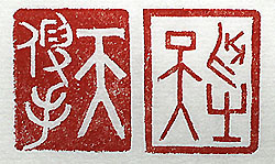 縦横・・3x2.4cm 今回は「天」の字の配置を諸々考え、其れに相応しい印文 を考え、甲骨文で刻した「別有天」(別に天有り」と、金文で 刻した「天假手」(天は手を假る)である。「別云々」は、唐の 李白の「山中問答」に有る、「別に天地の人間に非ざる有り 」の句を少しアレンジし、「天云々」は、『書經』の伊訓篇の 一句「皇天災を降し手を我が有命に假る」をアレンジしたも のである。この世には眼前の世界とは異なる別世界が有る と言い、天は人の手を借りて意志を遂行すると言う。斯く有 らば、今の己は別世界に逃避などせず、己の自助努力で 病魔に打ち勝つ事が求められている、と言えよう。さあ勝つ ぞ、勝つぞ、打ち勝つぞ。 |