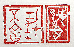 縦横・・3x1.4、3x3cm 『史記』伯夷傳の注の語を、甲骨文で刻した「洗耳」(耳を 洗う)と、『荀子』勸學篇の一句を金文で刻した、「功在不 舍」(功は舍かざるに在り)とである。昔、堯から天下を讓 と言う話を聴かされた許由が、耳が穢れたと言って潁川 で耳を洗った故事に基づき、本來は嫌な事を聞いた時に 使う言葉であるが、人の話を真面目に聞こうとする時も、 「洗耳謹聽」とか「洗耳恭聽」とか言う。亦た「功云々」は、 物事で功績を挙げるには途中で止めない事で、學問は繼 續こそが重要であると言う。此は何も學問だけの話ではな い、昔から「石の上にも三年」と言う通り、或る程度の繼續 は絶対必要であり、真に何かを身に付け様としたならば、 其れは一生の繼續である。 |