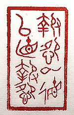 縦横・・5x3cm 老子と孔子が共に同じ内容の事を言っている。其處で 『老子』第六十三章の一句と、『論語』憲問篇の一句と を並べて、金文で刻した「報怨以コ以直報怨」(怨みに 報ゆるにコを以てし、直を以て怨に報ゆ)である。同じ 文字が三個有るが、微妙に變化を持たせた。怨みに 報いるのに怨みを以てすれば、怨みが怨みを招く負の スパイラルに陥り、終わりが無くなってしまう。故にこそ 例え怨みに對してでもコや直で對應すべきなのである が、小生の如き凡人は、なかなかそうは行かない。 |