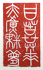 縦横・・5x3cm 古璽文で刻した、「甘苦共來亦黄粱夢」(甘苦共に來た るも亦た黄粱の夢)である。「黄粱夢」とは人生の儚さ 言った言葉で、唐代傳奇小説『枕中記』で、邯鄲の宿 場で廬生が道士の呂翁から貰った枕でうたた寝し、夢 で己の栄枯盛衰を見るが、夢から覚めると宿の黄粱飯 が炊きあがった所であったと言う。「邯鄲の一炊、黄粱 の夢」とも言う。己の半生を振り返るに、將に『一場の春 夢、黄粱の夢」である。何かに付けて思い出すのは、田 舎での子供時代と學生時代である。失敗も挫折も有っ たが「所詮人生は成る様に成る」と思い、好きな事を前 向きに樂しんでこれた時代であった。所がいざ退職して 「さあこれからは悠々自適の老人生活」と思いきや、現 實は金錢・病魔・生活等々に追われ悩む、悲觀的生活 の日々である。此も人生ならば、善哉善哉であろうか。 |