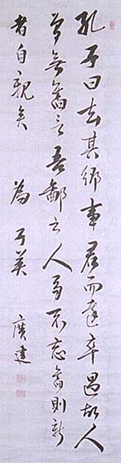 紙本肉筆・・縦110cm、横28cm 「為子美 廣建」の下に、陰刻「廣瀬建印」と陽刻「子 基氏」の落款が押されている。廣瀬淡窓は豊後の人 で、名は建、字は子基、号を淡窓・・青溪・苓陽など と称し、十六歳で博多の亀井塾(亀井南冥・昭陽父 子)に入門して漢学を修め、帰郷後に家塾咸宜園を 開いて門弟に教授し、経学の老荘を兼修した独特の 学風を形成し、同時に詩を善くし、来学者は四千人 以上に登り、鎮西の大詩宗・西海の詩聖と称された 儒者である。四十五歳以前は、名を簡、字を廉卿と 称していれば、本品は四十五歳以後の作である。「 子美」とは、恐らく門弟の誰かの字であろう。書かれ ている孔子の言葉からして、咸宜園から巣立ち何処 かの藩に仕官する弟子に、餞に書き送った様に見 受けられる。 |