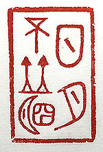 縦横・・4.7x3cm 『鹽鐵論』刺復篇の一句を金文で刻した、「日月不並明 」(日月は明を並べず)である。決して同時には行われ 無い事を示す言葉である。「寒暑時を兼ねて至らず」と も言うが、最近の異常氣象を見る限りでは、「寒暑時を 兼ぬ」が起きても不思議では無い。しかし、「日月の明 を並ぶ」事は決して無い。もし起きたなら、其れは地球 の終焉であろう。 |