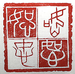 縦横・5.8x5.8cm いよいよ駄印二千個を目指すに當って、さて一體何を刻 そうかと思っていたら、十年程前の現職時代が頭に浮か んだ。故河野先生から「彫れ、彫れ」と逼られ、已むを得ず 「何を彫れば善いんだ」と聞いた所、「何でも中林さんの思 った言葉を彫れば良いんだよ」と言われた。其處で漢文を 讀み始めて以來常に心に在り續け、今に至るも常に考え させられる一字を刻した。其れが「恕」である。今初心に返 り、改めて「恕」字を刻し二千個への一歩とする事にした。 回印で甲骨文・金文・戰國三晉篆文・古璽文の四種類で刻 した四態「恕」字である。 |