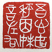 縦横・3.9x3.9cm 古璽文で刻した、「吾心如秤因妹言左右」(吾が心は秤 の如し妹《つま》の言に因り左右す)である。最近妻から 小言や注意される事が多くなった。そのたび毎に己の 心は左右上下に揺れ動く、將にスイングハートである。 最近京都橘高校吹奏樂部の十八番の醉であるが、小 生もベニーグッドマンの音樂が聴きたくなった気分であ る。 |