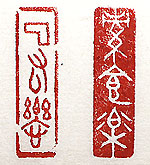縦横・3.2x0.8cm これも『論語』であるが、述而篇の十六に「子曰く、疏食を ひ水を飲み肱を曲げて子を枕とす。樂も亦た其の中に在り」 と有る。其れをアレンジして戰國篆文で刻した、「素(疏)食樂 」(素食の樂)と、古璽文で刻した「曲肱樂」(曲肱の樂)とであ る。貧しい中にも樂は有ると言う事である。漢文の面白さは、 原文の意味を變えずに字數が増やせる點で、四字句にした ければ「樂」の上に「之」を加えれば善い、五字句であれば終 尾詞の「也」「矣」「焉」等を加えれば善いし、七字句であれば 出だしに「不亦」を加えて終尾詞を「乎」にすれば、「亦た曲肱 の樂ならずや」と成り、「なんとまあ曲肱の樂ではあるまいか」 と言う意味で最初の「曲肱の樂である」と本質的に變わらない 。更に八字句か九字句にしたければ、其の上に感嘆詞の「噫 」か「嗚呼」を付ければ良い。此が漢文の妙味で、一つの言葉 が有れば其處から諸字句の言葉が作れるが、全ての語句 に當てはまるものでは無く、出來る言葉と出來ない言葉との 辨別が必要である。今回は、石の長さから三字句にした、殘 念ながら己の力量では四字句は彫れなかった。 |