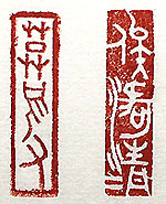 縦横・3.2x0.88cm 『春秋左氏傳』襄公八年の一句を、金文で刻した「俟河清」(河 の清を俟つ)と、『宋史』卷三百六十五岳飛傳の一節を、甲骨 文で刻した「莫須有」(須く有るべきこと莫からんや)とである。 「俟云々」は、當てにならない事を當てにする事であり、『左傳 』には、「周詩に之れ有りて曰く、河の清を俟たば、人壽幾何 ぞ」と有り、所謂「百年河清を俟つ」である。「莫云々」は、有 るかも知れないと言う意味で、でっち上げの罪名を指す様にな る。此の言葉は、遼に敵對して宋に忠節報國を盡していた岳 飛に對し、其れを鬱陶しく邪魔に思った秦檜が、岳飛を陥れる 可く適當に理由を作り上げ謀反の罪で獄に入れ、其れに異議 を唱えた韓世忠が秦檜に詰問し、檜は「其の事體は須く有る べきこと莫からんや」と答え、世忠は「莫須有の三字、何を以て 天下を服せんや」と言っている。岳飛最後の場面は、あくまで テレビの中國ドラマに過ぎないが、名場面である。岳飛は粛々 と處刑に赴き、南宋の皇帝高宗は、天を仰ぎ見て「お前が不 忠だからでは無い、忠だからこそこうなった」と呟き、高宗の 母親は「二度とお前の顔など見たくない」と言って高宗を拒絶 する。 |