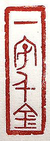 縦横・4.8x1.5cm 『史記』呂不韋傳の一句を金文で刻した、「一字千金」で ある。文字や文章が優れている事を表現した言葉である。 呂不韋傳には、「書を著し天下に布く、・・・號して呂氏春 秋と曰ひ、咸陽の市門に布き千金を其の上に懸け、諸侯 游士賓客を延き、能く一字を増損する者有らば、千金を 予へん」と有る。『呂氏春秋』に對する呂不韋の自負と矜 持の言葉でもある。小生の石彫りなんぞは、例え千石以 上彫ったにしても、所詮「千石無金」の代物に過ぎない。 |