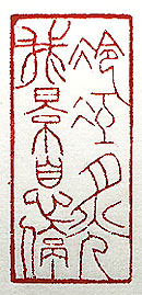 縦横・5x2.4cm 急に思い立って小篆で刻した、「冷冱月光我影息停」(冷 冱たる月光に我が影も息停す)である。玲瓏として寒々と 澄み渡った月光を見上げ、思わず吾が足も止まり、影も 微動だにせず地上に黒く蟠っている。後一ヶ月程過ぎれ ば、この様な状況にも遇えそうである。秋の月は例え寒 々としていても、何處か心に染み入るものである。其れ は兎も角、小篆は文字バランスが難しい。全く駄目駄目 で、バランスの悪さと線の撚れだけが目立つ、酷いもの に成ってしまった。 |