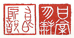 縦横・2.4x2.4cm 『詩經』召南甘棠の一句を各々古璽文で刻した、「甘棠勿 」(甘棠拜《ぬ》くこと勿れ)と、「召伯所説」(召伯の説《やど 》りし所なり)とである。周王朝の初期四代に渉って仕えた 召公奭を讃えた言葉で、「甘棠之詠」「甘棠之愛」の典據 となった故事で、彼は善政を行い甘棠樹の下で、人民の 訴訟を聞き公平に裁斷したと傳える。『詩經』には、「蔽 芾たる甘棠、翦ること勿れ、拜くこと勿れ、召伯の説りし所 」と詠じている。周公旦に召公奭、この様な人物に出會って みたいものだと思うが、所詮夢の亦た夢であろう、そうで あるならば、せめて夢の中で良いから語り合ってみたい。 |