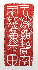 縦横・5x2.4cm この二三日急に秋らしくなった。夜布團を出して月を眺め ると、田舎の事が思い出された、生家の神社の秋の大祭 (10月1日)ももうすぐである。この時期子供時代に日常 的に見ていた風景が頭に浮かび、古璽文で即興的に刻 した「雲流紺碧空風渉黄金田」(雲は流る紺碧の空、風は 渉る黄金の田」である。黄金色になった田の稲穂を風が 揺らし、見上げれば紺碧の空に白い筋雲が流れている。 其れが当たり前の景色であったが、今は餘り見られない 、其れ所か天變地異の氣象状況の中で、瑞穂の國が藻 掻き咆吼しているみたいである。 |