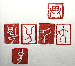 縦横・1.6x1.6、2.1x1.6cm 昨日に引き續き未識徽號文字六顆であるが、本日は甲骨文字 の未識徽號文字こ刻してみた。中國の古代文字は、二十世紀初 頭以來今に至るまで、陸續として其の遺物は發掘され續けてい る。其の數は膨大な數に及ぶが、其れが全て解讀されている譯 では決して無い。甲骨文にしろ金文にしろ陶文にしろ、未解讀・ 未解釋の文字所謂未識徽號文字と稱されるものが多數存在す る。見て樂しいのは意匠的に金文の未識徽號文字であるが、同 型の文字を甲骨文・金文共に採取しながらも、両方とも未解釋の ものが有る。其の中から甲骨文の未識徽號文字を選んで刻して みた。一見文字として判讀出來そうな感じもするのだが、・・・。 |
