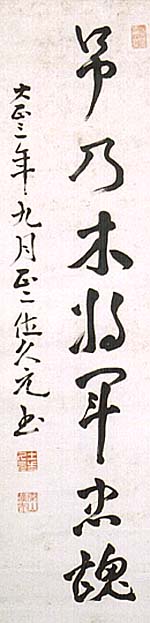 紙本肉筆・・縦124.5cm、横29.5cm 「大正三年九月正二位久元書」の下に、陰刻「土方久 元」と陽刻「秦山」の落款が押されている。土方秦山は 土佐の人で、名は久元、字は?、号を秦山と称し、土 佐勤皇党に参加し、藩命に因って上洛し、三条実美の 信を得て学習院御用掛となり「七卿落ち」に随行し、中 岡慎太郎と共に薩長同盟に尽力し、維新後は明治天 皇に信任されて宮内大臣・宮中顧問官・枢密顧問官 などを歴任した伯爵で、大正初期には「生きたる勤皇 討幕史」として有名で、幕末の様子を描いた『回転実 記』を著している。かの『銭形平次』の作者野村胡堂も 報知新聞記者としてインタビューし、その修羅場を潜っ た迫力に肝を冷やしたことを記している。彼は、大正 から昭和にかけて、築地小劇場を拠点に新劇運動を 興した演出家、土方与志(久敬)の祖父でもある。 |