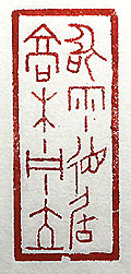 縦横・5x2.1cm 同窓同期で同僚でもあった知友のT氏が、文化功勞者と 成られた。病苦の中で日々石彫りしている己にとっては、 久々の朗報である。「よし、己ももう少し頑張って生きるか 」と大いに励みになり、何處か心が浮き立ち氣持が晴れ やかに成った。すると訓讀屋の悪い癖であるが、何か言 葉を作って彫りたくなる。其處で即興的に言葉を考え、一 時間程で甲骨文で刻した、「聖雨コ育高木佇立」(聖雨は コ育し高木は佇立す)である。若い時時空間を共にした 老人漢學者の遊び心に過ぎない。もし御本人の氣分を害 したならば、何卒ご海容を賜りたい。 |
