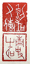縦横・2.4x2.1cm 朝からパラパラと唐代の散文を讀んでいたら、李華の「政事 堂記」の一句に目が止まった。其れを甲骨文で刻した「列國 有傳」と「青史有名」(列國に傳有り、青史に名有り)である。 己には列國も青史も無縁であり、因って「傳」も「名」も何も 無い、單なる路傍の駄石にしか過ぎず、將に彫っている駄 印そのものであろう。 |