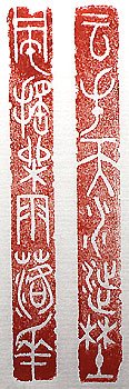 縦横・7.6x0.9cm 古璽文で刻した對句で、「雲屯天水渉野」(雲は天に屯し 水は野を渉る)と、「風揺柳雨落花」(風は柳を揺らし雨は 花を落とす)とである。即興で思った言葉を刻したに過ぎ ないが、ニュースで見聞した世界の洪水被害に心を痛め つつ、眼前の小庭に目を轉ずれば、其処は微風小雨の 風流世界である。不謹慎とは思ったが、即興的に大世界 と小世界とを並べてみた。 |