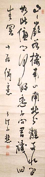 紙本肉筆・・縦116.3cm、横32.7cm 「山居偶意 百拙山樵」の下に、陰刻「東參山人」と陽 刻「百拙山樵」の落款が押されている。百拙元養は京 の人で、俗姓は原田氏、法名は元養(元椿)、道号は 百拙、雅号を釣雪・葦庵などと称し、初め臨済禅に入 って大随玄機に師事し、後に黄檗宗佛国寺の高泉に 就き、佛国寺第九代となり、海雲山法蔵寺を創建し、 近衛家煕や烏丸光広の帰依を得た禅僧で、書画に優 れ詩歌や茶道にも通じた僧である。 |