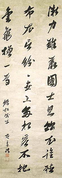 紙本肉筆・・縦128cm、横51cm 「太宰純」の下に、陰刻「太宰純印」と陽刻「字曰徳 夫」の落款が押されている。太宰春臺は信州飯田の 人で、本姓は平手氏、姻戚太宰氏の嗣となり、名は 純、字は徳夫、号を春臺・紫芝園などと称し、初め 朱子学を学ぶが、後に荻生徂徠の門に入り、徂徠 没後はその学の継承者として名声を得るが、詩文 に関しては李・王の古文辞を斥けている。博学で律 暦・天文・音韻などにも通じた儒者である。 |