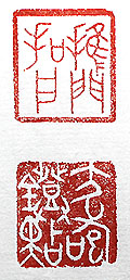 縦横・2.2x2cm 最近老人のセンチメンタルジャーニーと言うか、ノスタルジ ーと言う可きか、矢鱈に昔の事が頭を過ぎる。半世紀以上 昔の幼稚園時代を思い起こしながら、拙文を作ってみた。 吾得病苦憶少時、乃追慕昔事刻之。 黄波揺田笛鼓流、秋祀方近喜豊年、 郷人乘月携酒遊、無時無處互擧巵、 推門犬咆知人來、叩戸燈點談世情、 莫笑盃周睡軒下、酔狂將自在此中。 乙巳季春士雲作 其處で金文で刻した、「推門叩戸」と「犬咆燈點」(門を推し 戸を叩かば犬は咆え燈は點ず)である。何かつまらぬ物を 彫っている様で、氣分は鬱々たるものがある。 |