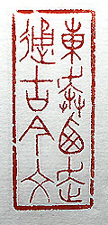 縦横・5x2cm 戰國篆文で刻した「東奔西走通古今文」(東奔西走して 古今の文に通ず)である。確かに若い時は東奔西走し て諸々の文献を渉猟したが、だからと言って決して古今 の文に通じる事は無かった。單に渉猟したに過ぎず、そ れが如何ほど血となり肉となったかは、甚だ疑問が生じ る。今も東奔西走の重要性は分かっているが、如何せん 今度は體力が伴わない。一つ悟れば一つ何かが失われ る、此が老化と言うものであろう。 |