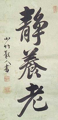 紙本肉筆・・縦53cm、横28.7cm 「小竹散人書」の下に、陰刻「篠崎弼印」と陽刻「承 弼氏」の落款が押されている。篠崎小竹は豊後の人 で、名は弼、字は承弼、号を小竹・畏堂・退庵などと 称し、本姓は加藤氏である。彼は、九歳の時に篠崎 三島に学んでその養子となり、十九歳で江戸に遊び 尾藤二洲の学を聞き、一度帰阪後に再び江戸に出 て古賀精里に学び、その後大阪に帰って朱子学を 奉じ、父三島に代わって門弟に教授した儒者で、同 時に詩文と書でも名高かった人である。 |
