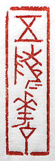 縦横・4x1.2cm 金文で刻した、「五陵華才」(五陵にて才を華《かがや》 かす)である。華やかに才能を外に表す事の言葉であ る。「五陵」は、豪遊富貴の家の子弟達を指しており、李 白の「少年行」に、「五陵の年少金市の東、銀鞍白馬春 風を度る、落花踏み盡して何れの處にか遊ぶ、笑ひて入 る胡姫の酒肆の中」と有る。尚、「五陵の華才」と讀んで も、意味は通じる。 |