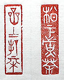 縦横・3.8x1cm 武侠ドラマの「天龍八部」より、目に止まった場面を古璽文 で刻した、對聯の「松下煮茶」(松下にて茶を煮る)と、「岩 (嵒)上打棋」(岩上にて棋を打つ)とである。最近の武侠ド ラマは、イケメンとCGの多用で、何處か嘘っぽく樂しく無い 。昔のワイヤーロープアクション時代を懐かしく感じるのは 、老人の感傷に過ぎないであろう。 |