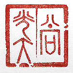 縦横・2.9x2.9cm 『文心雕龍』詮賦篇の一語を古璽文で刻した、「尚光大 」(光大を尚ぶ)である。詮賦篇には、「義は光大を尚ぶ 」と有るが、「光大」自體は、『周易』坤の「含弘光大」や「 知は光大」を初出とする。『漢書』董仲舒傳には、「其の 知る所を行はば則ち光大なり」と有り、『抱朴子』釋滞篇 には、「以て光大を崇ぶ」と有る。因みに「光」は「廣」に 通じ、「光大」は「廣大」でもある。 |