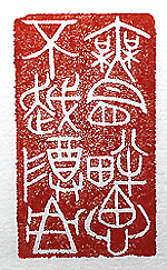 縦横・5×3cm 金文で刻した、「無冒畔心不越樽俎」(畔を冒すの心無 く樽俎を越えず)である。己の職分を守り他人の職権を 冒す事が無い様に心懸け、己の分を辨えずしゃしゃり 出て他人の権限の中に立ち入る事はしない、と言う内容 の言葉である。此は、『春秋左氏傳』襄公二十五年に有 る、「行いて思を越ゆる無し、農の畔有るが如し、其の 過は鮮し」の故事と、『荘子』逍遙遊に有る、「庖人庖を 治めずと雖も尸祝は樽俎を越えて之に代らず」の話に 基づいて、二つを合わせた言葉である。 |