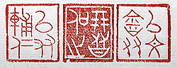 縦横・2.2×2.2cm 昨日に續き「朋友」に關する言葉で、左右の朱文は顔淵 篇の一語を金文出刻した、「以文會友」(文を以て友を會 す)と、「以友輔仁」(友を以て仁を輔く)とであり、中央の 白文は公冶金長篇の一語を古璽文で刻した、「朋友信之 」(朋友は之を信ぜしむ)である。三個續けて讀めば、「文 を以て友を會し、朋友には之を信ぜしめ、友を以て仁を輔 く」となり、一應意味の通る言葉となる。己の場合は、「遊 を以て友を會し、朋友は之を共にし、友を以て樂を輔く」 であった様に思う。。 |