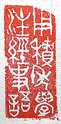 縦横・5×2cm 金文で刻した、「用積年學注經史語」(積年の學を用って 經史の語を注す)である。今も数カ所で漢文を讀んでい るが、初見の文獻を讀む時は大概この様である。しかし 、最近はこの積年の學が忘却の彼方に遠ざかり、諸々 難渋する事が多い。例え積年の學であっても、日々日常 的に駆使していないと、徐々に減少し利息に因る小回り どころか元本に基づく基本さえ、時として瞬時に出て來 ない事が有る。技術的行爲は、日々使用してアップデイ トしていないと、いざと言う時に役に立たなくなってしまう 、と言う事を痛感させられるこの頃である。 |