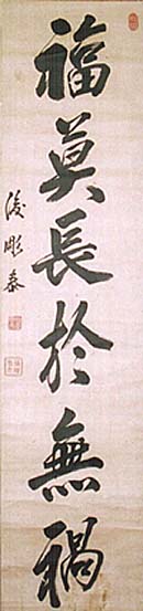 紙本肉筆・・縦123cm、横28.5cm 「後彫泰」の下に、陰刻「菅斉泰」と陽刻「後彫老人」の落 款が押されている。前田後彫は加賀の人で、名は斉泰( 幼名は利康)、号を後彫と称した、加賀藩第十三代藩主 である。前田家は菅原氏で、前田利家も菅原利家と名乗 っていた記録がある。菅原斉泰こと前田斉泰は、正二位 権中納言加賀藩主で、文政五年・1822に家督を継ぎ、 慶応二年・1866に嫡男慶寧に家督を譲っている。 |