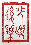 縦横・3.4×2.2cm 有名な言葉である。北宋の名宰相范仲淹の名文「岳陽 樓記」の一節をアレンジし、金文出刻した「先憂後樂」 (憂を先にし樂を後にす)である。爲政者たる者は、民 衆に先立ちて「「先憂後樂」の心を、常に持ち續ける必 要が有る。記には、「其れ必ず天下の憂に先んじて憂 ひ、天下の樂に後れて樂しむと曰んか」と有る。自ら米 を賣った事など無い人が、米価を下げると太言し、尤も らしい事を言った所で、何か白々しい。政治家の意識 は、何處か大衆から乖離している様に見受けられる。 |