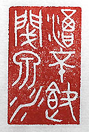 縦横・3.8×2.4cm 西晉の陸機の樂府「猛虎行」の一句を、古璽文で刻した 「渇不飲盗泉水」(渇するも盗泉の水を飲まず)である。如 何なる状況に置かれても、決して道に背く行いは採らない と言う事である。猛虎行には、「渇するも盗泉の水を飲ま ず、熱するも悪木の蔭に息はず」と有る。しかし、此は聖 人君子の行動で、己の如き凡人は「貧すれば貪す」で、 學生時代の帰郷列車に乗った時、其れこそ一錢も無く 數日前からの空腹に堪えきれず、人様の殘り辨當欲し さに、夜行寝臺列車のゴミ箱を漁った事も有った、其の時 は餘りにも己の情けなさと淺ましさに、車窓を見ながら涙 が流れ、己は落ちる所まで落ちたのかなあ、どの面下げ て親に會えるのか、などと暗澹たる氣持であった記憶は、 決して今も消えていない。 |