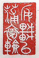 縦横・3.8×2.4cm 『漢書』儒林傳申公の一節を、金文で刻した「安車以蒲裹 輪」(安車は蒲を以て輪を裹《つつ》む)で、老人を勞り手 厚く待遇する事である。所謂四字句の「安車蒲輪」の典拠 である。申公傳には、「上は使をして束帛には璧を加へ、 安車には蒲を以て輪を裹み、駟を駕し申公を迎へしむ」 と有る。己などは誰も安車など用意してくれない、一時間 以内の距離であれば、自転車でえっちらおっちら出向く、 真夏日であろが雪が降ろうが、「熱いなあ、寒いなあ」な どと愚痴を言いながら、汗を垂らし指をこごらせ、自転車 である。しかし、半年程前妻が憐れみ、「蒲を以て輪を裹 む」べく電動自転車を買ってくれた、以來樂ちん樂ちんで ある。 |