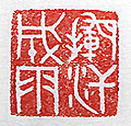 縦横・2×2cm 『晏子春秋』内篇雜下の一句を、古璽文で刻した「揮汗 成雨」(汗を揮はば雨と成る)である。人々が街路に溢れ 充ち満ちている様を誇張した言葉である。雜下には、「 袂を張らば陰を成し、汗を揮はば雨と成る」と有る。これ は、晏子が呉に使いした時、「お前の國には優秀な人材 が居るのか」と馬鹿にされた時、其れに言い返した言葉 である。 |