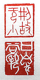 縦横・2.2×2cm 『書經』大禹謨の一句を、金文で刻した「刑故无小」(故を刑 するに小无し)と、『漢書』高帝紀上の一句を甲骨文の回文 で刻した「口尚乳臭」(口に尚ほ乳臭あり)とである。「刑故 ・・」は、故意に犯した罪は、例え小さな罪でも必ず處罰する、 と言う意味で、大禹謨には、「過を宥《ゆる》すに大無く、故 を刑するに小無し」と有る。意識的な行爲で罪を犯せば、微 小であっても罪は罪なのである。「口尚・・」は、若くて經験に 乏しい事の例で、「嘴が青い」と言うのと同じである。高帝紀 上には、「是れ口に尚ほ乳臭あり、韓信に當る能はず」と有 る。漢文訓讀も「五十六十まだひよこ」と言われて來た、さす れば己などはやっと子供で、將に口に尚ほ乳臭有る餓鬼に 過ぎないのである。 |