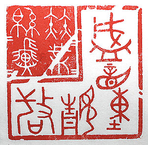 縦横・7×7cm 印面に大きなひび割れが三カ所も有る石に、何とか其處 を避けながら刻してみたが、矢張り可成り石が壊れてし まった。この大きさに何を彫ろうかと考えたが、『詩經』の 大雅常武に「赫赫業業綿綿翼翼」と言う句が有り、其の 毛傳に「赫赫然として盛なり、業業然として動なり、綿綿 は靚なり、翼翼は敬なり」と有る。其處で本文の「赫々業 々綿々翼々」を戰國篆文の白文で刻し、毛傳の「盛動靚 敬」を金文の朱文で刻してみた。しかし、殘念な事に左中 程の斜めのひびが大きく壊れて剥離し、「業」字の一部が 飛び、「敬」字の線一本が消えてしまった。故に此は失敗 作である。 |