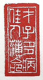 縦横・5×2.4cm 昔から良く言われる言葉を、印篆で刻した「才子多病 佳人薄命」である。頭がよい才能有る人は病氣がちで あり、美人は不幸短命の人が多い、と言う事であるが、 此の言葉出典が良く分からない。「佳人云々」は、蘇軾 の「薄命佳人詩」に、「古より佳人多くは命薄く、門を閉 ざし春盡きて楊花落つ」と有るが、「才子云々」は不明 である。亦た此の兩句を使ったものとしては、明治の政 治小説『雪中梅』(末廣鐵腸)の序文の出だしに、「(盗 )跖は富んで顔(回)は貧しく、美人薄命にして才子多病 なり、大聲は里耳に入らず、陽春白雲の歌は、人の和 するもの少なし」と有るが、「佳人」ではなく「美人」であ る。まあ美人も佳人も同じ事であるから、取り敢えず典 據は『雪中梅』としておく。 |