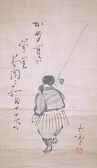 紙本肉筆・・縦72cm、横43cm 「かめの背や 萬里長閑(のどか)に 和田(わた)る糸 小波 」の下に、陽刻「東海小波」の落款が有る。巌谷小波は東京 の人で、名は季雄、号を小波・漣山人・樂天居などと称し、祖 母から国学や和歌を、父(明治初期の書の三大家の一人で ある巖谷一六)から漢詩作法を、書生から俳句作法などを学 び、児童文学作家(日本昔話・日本お伽噺などを叢刊)である と同時に、作詞家(一寸法師・富士の山など)で俳人でもある。 本品は、日本昔話の浦島太郎の話をモチーフにしている。 |