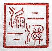 縦横・4×4cm 『荘子』譲王篇の一句を、金文の回印で刻した「上漏下 濕」(上は漏れ下は濕る)である。甚だ粗末な荒ら屋を 表した言葉である。「茅茨剪らず土階三等のみ」と略同 内容である。穣王篇には、「環堵の室、茨くに草を以て す、蓬戸完からず、桑以て樞と爲し、甕牖二室、褐以て 塞を爲し、上は漏れ下は濕る、匡坐して弦す」と有る。 己の茅屋は此ほどでは無いが、「壁に風有り窓に塵有 り」と言う状況である。 |