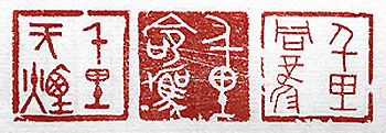 縦横・・2.4×2.4cm 偶々杜牧の「江南春」の「千里鶯啼いて・・・」を調べてい たら、「千里」の付く言葉が數點頭に浮かんだ。其處で其 れを彫る事にし、甲骨文で刻した「千里同風」(千里風を同 じくす)と、金文で刻した「千里命駕」(千里駕を命ず)と、古 璽文で刻した「千里无(無)煙」(千里煙無し)とである。「同 風」は、風俗が同化されて天下が平和になる事の例えで、 『論衡』雷虚篇に、「夫れ千里風を同じくせず、百里雷を共 にせず」と有り、「命駕」は、遠方の知人を遙々訪ねる事の 例えで、『晉書』嵆康傳に、「東平の呂安、康の高致に服し 、一たび相思ふ毎に輒ち千里駕を命じ、康は友として之を 善とす」と有り、亦た「无煙」は、千里四方に渉って煮炊き の煙が上がらず、人々が甚だ困窮している様子を表した 言葉で、『三國志』衛覬傳に、「當今千里煙無く、遺民困苦 す」と有る。 |