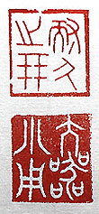 縦横・・2.3×2cm 『舊唐書』魏玄同傳の一語と『後漢處』邊譲傳の一語を、各 々金文で刻した「耐久之朋」(耐久の朋)と、「大器小用」とで ある。「耐久云々」は、何時までも變わらぬ友情で結ばれた 友のことで、魏玄同傳には、「玄同素より裴炎と交を結び、 能く終始を保つ、時人呼びて耐久の朋と爲す」と有り、「大 器云々」は、優秀な人材に詰まらぬ仕事をさせる事で、邊 譲傳には、「此れ大器の小用に於ける、固より宜しくせざる 所有るを言ふ」と有る。己は幸いな事に五十年來の耐久の 朋が有り、亦た小器にも拘わらず大用された事は僥倖であ ったと思っている。 |
