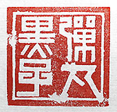 縦横・・4×4cm 北周庾信の南朝滅亡を詠じた壮大な叙事詩とでも言う 可き「哀江南賦」の一語を、印篆で刻した「彈丸黒子」で 、土地が甚だ極めて狭い事の例えである。哀江南賦の 後半部分には、「但だ坐して時變を觀、本より急難に情 無く、地は黒子と爲り、城は猶ほ彈丸のごとし、其の怨 は則ち黷れ、其の盟は則ち寒し」と有る。己が五十年近 く住んでいる東京の拙宅は、郷里の生家の大きさに比 べれば、おならも出來ない程小狭で、彈丸黒子よりも遙 かに狭い。 |