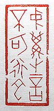 縦横・・2×2cm 『詩經』鄘風牆有茨の一句を、甲骨文で刻した「中冓之 言不可道也」(中冓の言は道《い》ふ可からざるなり)で 、閨の男女の睦言は、決して人に言う可きではない、と 言う事である。牆有茨には、「中冓の言は道ふ可からざ るなり、・・・詳にす可からざるなり、・・・讀《ぬ》く可からざ るなり」と有る。最近は睦言をこれ見よがしに公言する 人を、時たま見かけるが、將に笑う可し笑う可しであろ う。 |